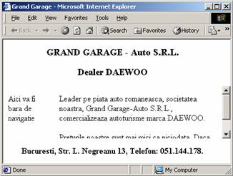 <!--antet.htm--> <html> <head> </head> <body> <center> <h3>GRAND GARAGE</h3> <h3>Auto S.R.L.</h3> <h3>Dealer DAEWOO</h3> </center> </body> </html> |