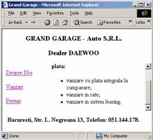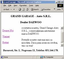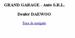 <!--antet.htm--> <html> <body> <h3 align="center">GRAND GARAGE - Auto S.R.L.</h3> <h3 align="center">Dealer DAEWOO</h3> </body> </html> |