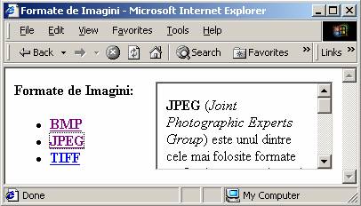 <html> <head> <title>Formate de Imagini</title> </head> <body> <iframe name="cadru" src="Generalitati.htm" width="200" height="100" border="3" align="right">Site realizat cu cadre in-line. Browserul dvs. nu suporta!</iframe> <b>Formate de Imagini: <ul> <li><a href="bmp.htm" target="cadru">BMP</a></li> <li><a href="jpeg.htm" target="cadru">JPEG</a></li> <li><a href="tiff.htm" target="cadru">TIFF</a></li> </ul> </b> </body> </html> |