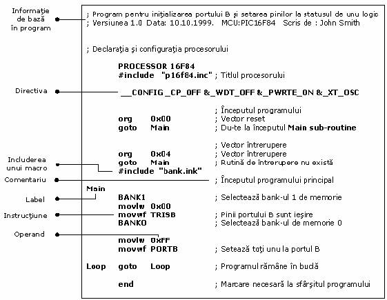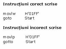 Instructiunile sunt deja definite prin folosirea unui microcontroler specific, asa ca ne ramâne doar sa urmam instructiunile pentru folosirea lor în limbajul de asamblare. Modul în care scriem o instructiune mai este numit "sintaxa" instructiunii. În exemplul urmator putem recunoaste o greseala în scriere pentru ca instructiunile movlp si goto nu exista pentru microcontrolerul PIC16F84.