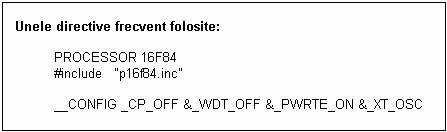 Sunt definite oscilatorul, aplicatia timer watchdog si circuitul intern de reset. Înainte de folosirea acestei directive, procesorul trebuie definit folosind directiva PROCESSOR.