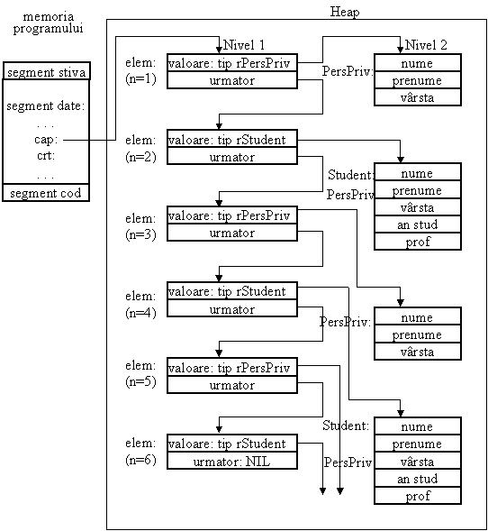 În cele ce urmeaza este prezentat un exemplu în acest sens. Reamintim ca obiectul Student este derivat din clasa Persoana. Exemplul mai contine o "lista" (în stânga tabloului Heap) care gestioneaza atât structurile de tip Persoana cât si structurile Student. Acest lucru este posibil prin existenta în partea de informatie utila a unui element din lista, a unui câmp de tip referinta care poate adresa ambele structuri. In acest fel, se poate ajunge la situatia in care parcurgând elementele listei si invocând pentru fiecare element executia unei metode virtuale existente in cele doua clase, se invoca de fapt folosind o unica declaratie, metode cu comportamente distincte.