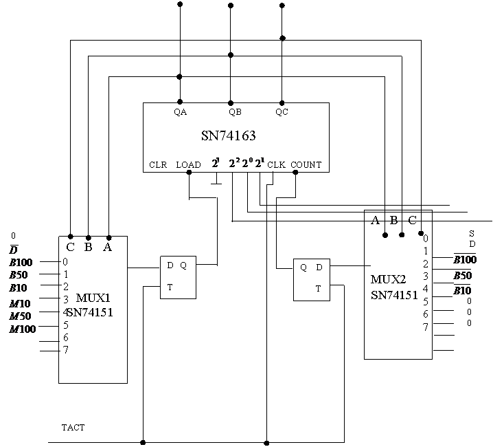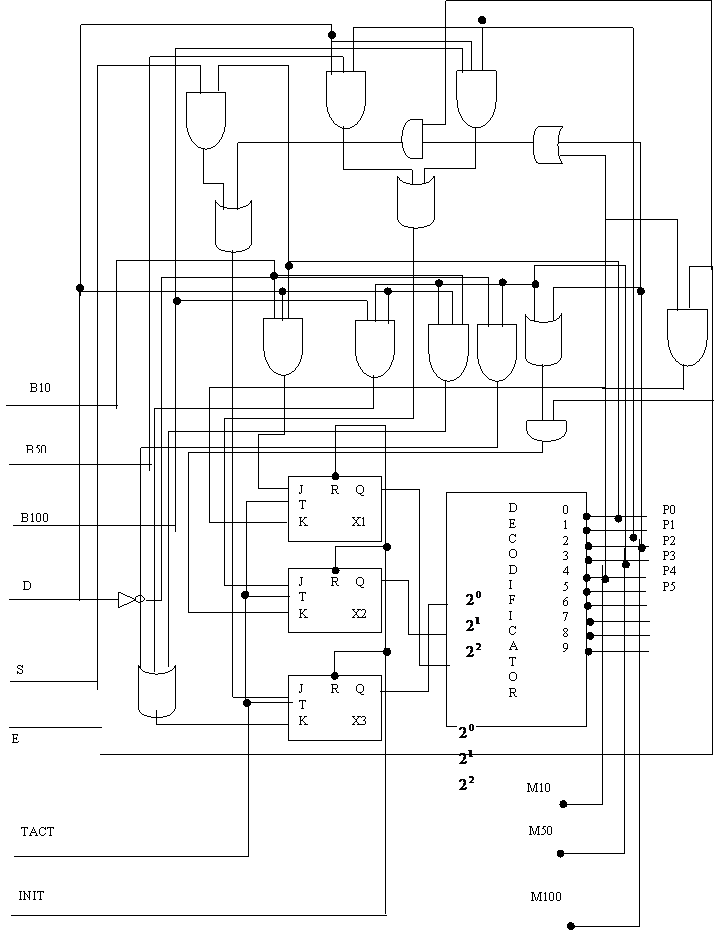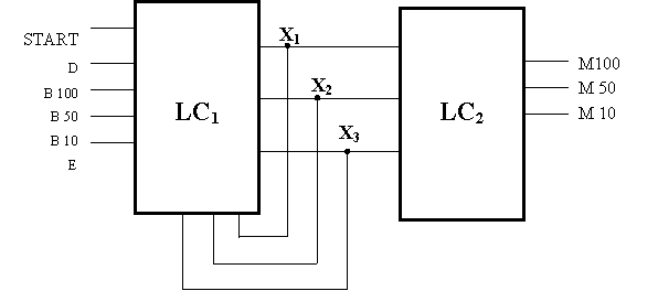D - aceasta variabila este furnizata de un bloc aritmetico-logic ce realizeaza calcule aritmetice in timp real, intre valorile bancnotei introduse si a celor oferite la schimb; are semnificatia urmatoare: in cazul in care se sesizeaza ca nu s-a intodus bancnota sau cand se solicita o suma mai mare decat cea disponibila are valoare 0, in celalalt caz, are valoarea 1 si se intra in procesul de schimbare al bancnotei.