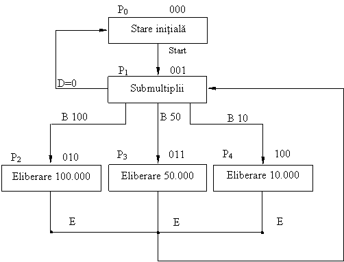 Diagrama de stari pentru automatul de schimbat bancnote si codificarea starilor