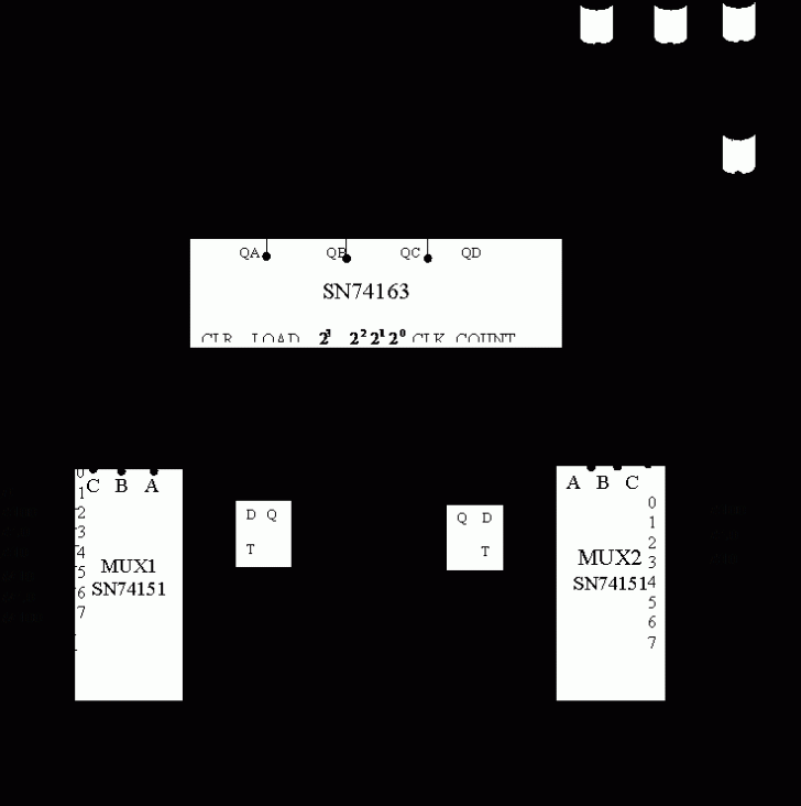 Utilizarea numaratoarelor cu incarcare paralela si a multiplexoarelor simplifica si mai mult sinteza circuitelor secventiale. Multiplexoarele folosite (SN74151) prezinta 8 intrari de date si 3 de adresa. Numaratorul pe care il vom utiliza - SN74163 - are 4 iesiri de date: QA, QB, QC, QD, o intrare de incarcare paralela LOAD, o intrare de initializare CLR, 4 intrari de date DA, DB, DC, DD, o intrarea de tact CLK si o intrare de numarare COUNT.