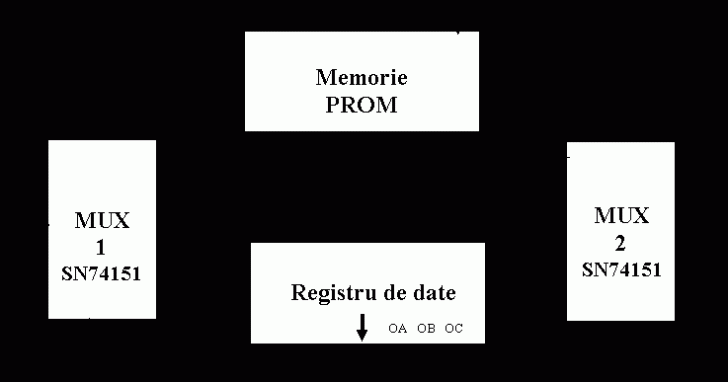 In schema prezentata mai sus, se pot observa doua multiplexoare, notate cu MUX1 si MUX2, o memorie PROM, a carui date se indreapta spre Registrul de date.