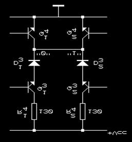 Să considerăm două porsi TTL de tip sI-NU cu structură obisnuită (etaj de iesire în contratimp) ale căror iesiri sunt cuplate în paralel (figura 5.1). Dacă ambele iesiri sunt simultan în 0 logic sau în 1 logic circuitul funcsionează corect. În cazul în care o iesire se află în 0 logic si alta în 1 logic se realizează practic punerea la masă a tranzistorului Q32, curentul prin acesta fiind limitat numai de dioda D32 si rezistensa R42 de 130 . Aceasta determină disiparea unei puteri excesiv de mari în tranzistoarele Q41 si Q32 si în rezistensa R42. Drept consecinsă, parametrii porsii se modifică, sau se distrug tranzistoarele prin ambalare termică.