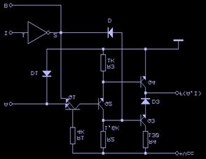 Intrarea de inhibare I permite funcsionarea ca un inversor obisnuit dacă I=0. Dacă I=1, B=0, D se deschide, Q1 se saturează, Q2 si Q4 se blochează, Q3 se va bloca si el deoarece prin dioda D deschisă potensialul bazei sale coboară la 0.7V deci circuitul va prezenta la iesire o impedansă mare (HZ - înaltă impedansă).