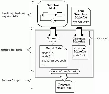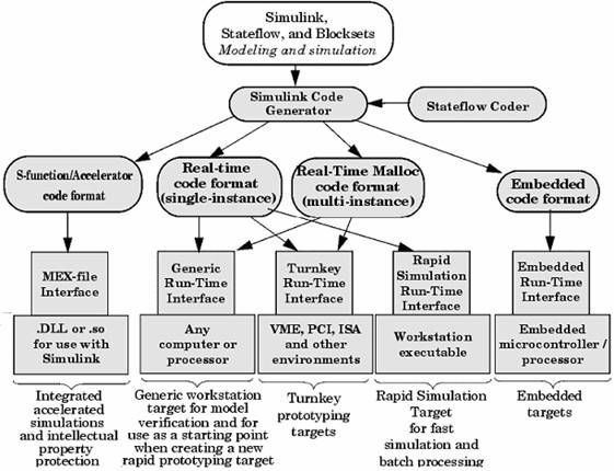 Simulink însusi este limbajul de programare care exprima portiunea de algoritm a sistemului. Generatorul de cod al Simulink furnizat împreuna cu RTW este un compilator grafic deschis care suporta o mare varietate de formate de cod de iesire relatiile între diferitele formate de cod si tinte este prezentat în figura de mai jos.