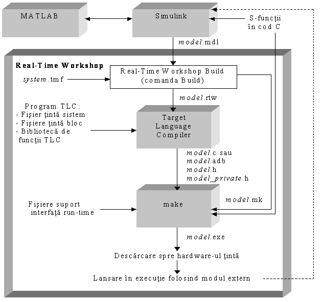 În figura de mai sus se reprezinta mediul integrat MATLAB/Simulink/RTW cu diferitele sale componente (blocurile umbrite indica partile componente ale RTW). Putem face urmatoarele precizari: