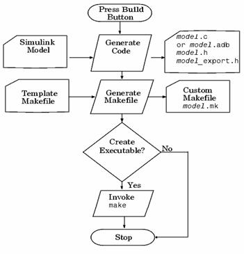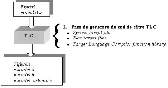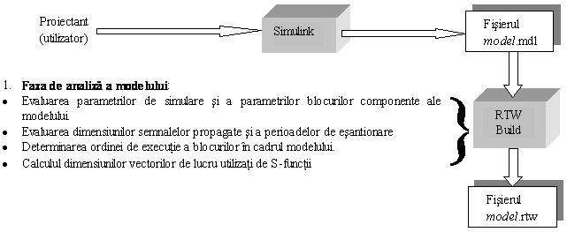 Se observa din figura ca aceste procese se desfasoara secvential si au ca intrari/iesiri fisiere care se construiesc automat. Fisierul de intrare în primul proces (RTW Build) este modelul Simulink model.mdl iar fisierul de iesire al ultimului proces (Make) este model.exe.