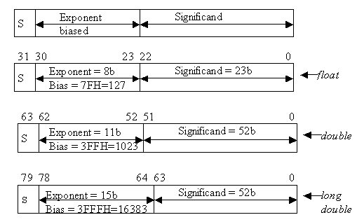 Tipurile float si double sunt formate pentru numere reale ce există numai în memorie. Când un astfel de număr este încărcat de procesor în stiva pentru numere reale (flotante) pentru prelucrare sau ca rezultat al prelucrării, el este automat convertit la formatul long double (sau extended).