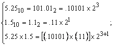 În final să analizăm un exemplu de procesare a produsului a două numere reale. Vrem să calculăm valoarea 5.25 x 1.5. Pentru aceasta, vom scrie cei doi factori ai produsului în forma: