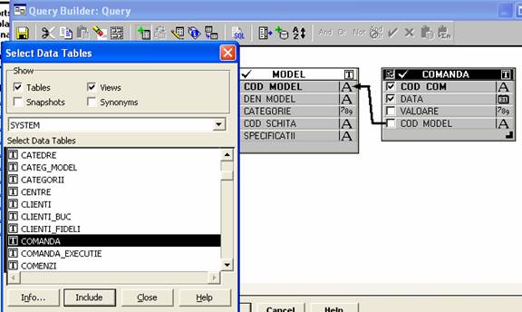 4. În cadrul Query Builder se includ tabelele din care vom prelua datele, în cazul nostru: Model, Comanda.