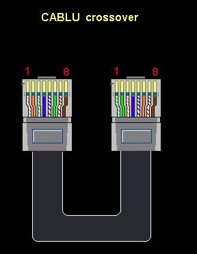 Cablu se mufeaza in doua feluri: daca nu exista switch se mufeaza cross; daca exista hub sau switch se mufeaza normal. Avem nevoie de doua mufe RJ45,cum sunt alea de tel. numai ca sunt un pic mai mari si au 8 pini. Cablul trebuie sa fie UTP Cat 5: este format din patru perechi torsadate; fiecare pereche are cite o culoare de baza; cele patru culori sunt : portocaliu, verde, albastru si maro Daca avem switch, in partea cealalta a cablului se mufeaza la fel. Daca nu exista switch, se mufeaza 1 cu 3 si 2 cu 6 (firul de la pinul 1 ajunge la pinul 3, iar firul de la pinul 2 ajunge la pinul 6 ). Avantajul switch-ului este ca se pot conecta mai multi la retea in functie de numarul porturilor, spre deosebire de un cablu cross caz in care nu putem pune decit doua calculatoare in retea. NOTA ! Reteaua nu foloseste decit doua perechi de cablu: 1 cu 2 si 3 cu 6. Perechile 4 cu 5 si 7 cu 8 nu sunt folosite. Dupa ce mufam cablu si introducem mufele in placile de retea, se poate porni la configurarea retelei - adica a sistemului de operare . |