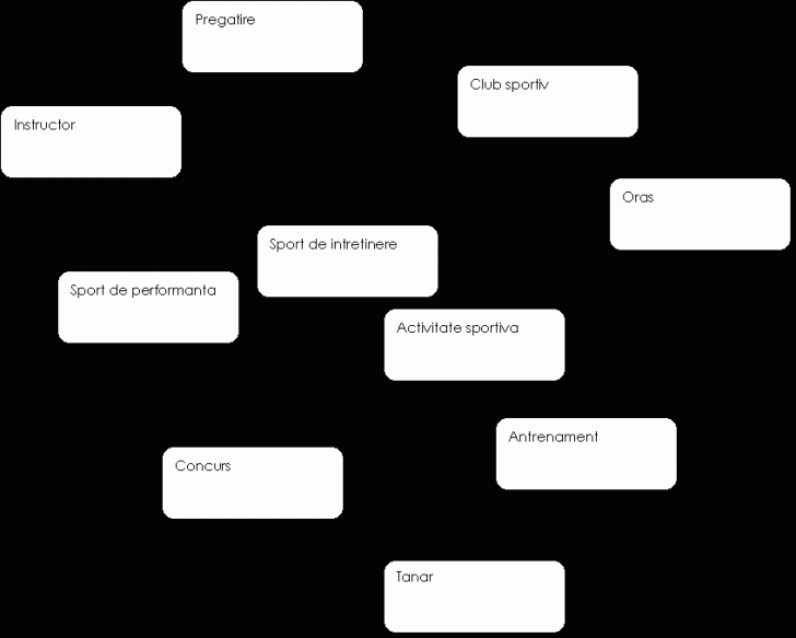 Într-un oras sunt mai multe cluburi sportive. Fiecare club sportiv are instructori care pregatesc tinerii atât pentru sport de performanta cât si pentru sport de intretinere. Tinerii se înscriu la diverse activitati sportive: fie pentru antrenament, fie pentru competitii sportive (concursuri). Activitatile sportive se desfasoara în sali special amenajate. Cerinte: