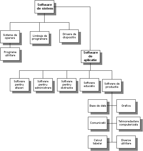 Īn concluzie, un calculator functioneaza datorita sistemului de operare instalat, si anume prin interactiunea sa cu resursele hardware ale calculatorului. Peste acest strat software, al sistemului de operare, ce are rolul de a interfata utilizatorul cu resursele hardware, se instaleaza aplicatiile care vor fi instrumente de lucru ale beneficiarilor sistemului de calcul. Īn figura 7.1.2 este prezentata o diagrama a tipurilor majore de software existente īntr-un calculator.