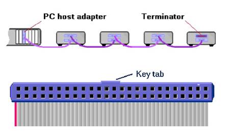 Deoarece SCSI este o magistrala, dispozitivele sunt conectate prin inlantuire in cascada