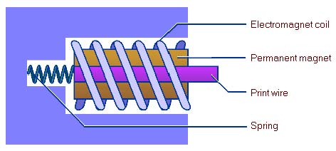 In majoritatea imprimantelor matriceale cu impact, exista un mecanism destul de complex care controleaza fiecare dintre acele de tiparire. In mod normal, acul de tiparire este tinut la distanta de panglica tusatasi de hartie cu un magnet permanent puternic, impotriva fortei unui resort care il impinge din spate. Magnetul este infasurat intr-o bobina ce formeazaun electromagnet cu polaritatea opusa celei a magnetului permanent. Pentru a lovi cu acul de tiparire panglica tusata din fata hartiei, electromagnetul este activat, iar campul sau il neutralizeaza pe cel al magnetului permanent. In lipsa fortei magnetului permanent, resortul impinge cu forta acul de tiparire spre panglica tusata, imprimand cerneala pe hartie. Dupa ce acul de tiparire deseneaza punctul respectiv, electromagnetul este dezactivat si magnetul permanent readuce acul de tiparire inapoi, in pozitia de asteptare, gata pentru o nouaactiune. In desenul de mai jos este prezentata o schema de principiu a mecanismului unui ac din capul de tipirire.
