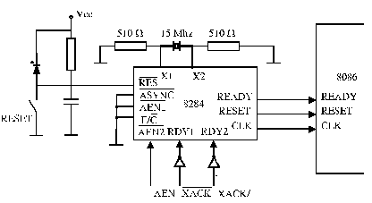 Pentru generatorul de tact se foloseste circuitul 8284. Acesta asigura o divizare cu 3 a frecventei, deci se va folosi un cristal de cuart cu frecventa de 15 Mhz, si un factor de umplere de 1/3. Intrarea F/C (Frequency/Cristal)=0 pentru a indica faptul ca frecventa este dat de cristalul de cuart. Initializarea sistemului se produce la conectarea tensiunii de alimentare precum si la apasarea unui buton de initializare. Semnalul RESET trebuie sa fie activ cel putin 4 perioade de tact (800 ns) respectiv numai 50 ns la cuplarea tensiunii. El va fi aplicat prin intermediul circuitului 8284.