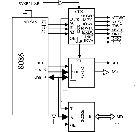 Schema indica si elementele necesare pentru demultiplexarea magistralei 8086 impreuna cu circuitele tampon aferente, precum si pentru generarea semnalelor de comanda pe magistrale, microprocesorul lucrand in mod maxim.