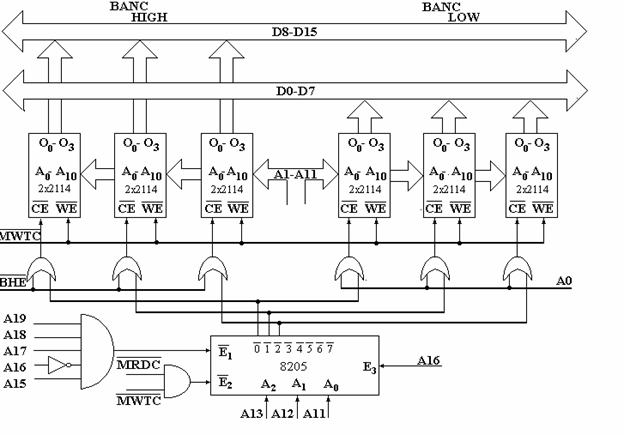 Intrarea ASYNC=0 sincronizeaza semnalul READY cu frontul pozitiv si negativ al tactului. Timpul de acces al circuitelor de memorie folosite (2716, 2114,2118) este mai mic decit durata a doua perioade de tact (400 ns) deci nu este necesara o logica de introducere a starilor de asteptare. Pentru demultiplexarea magistralei se folosesc latch-uri ai buffer-e bidirectionale. Adresele, impreuna cu bitul BHE, sunt retinute in circuitele latch 8282 (de 8 biti) cu impulsul ALE.