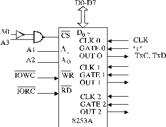 Circuitul 8253A este un numarator/temporizator programabil. Canalul 0 se foloseste pentru generarea impulsurilor de tact pentru transmisia seriala. Canalul 1 se foloseste ca ceas de timp real pentru intreruperi la intervale egale de timp. Modul in care este conectat circuitul este prezentat in figura 6.3.