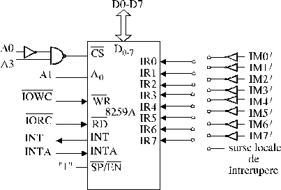 Circuitul 8259A este controler de intreruperi. Modul in care se conecteaza nivelele de intrerupere ale lui 8259A la liniile de intrerupere ale magistralei MULTIBUS si la sursele locale de intrerupere este lasat la latitudinea utilizatorului; in acest scop au fost prevazute conexiuni prin strapuri. Conectarea circuitului se face ca in figura 6.4.