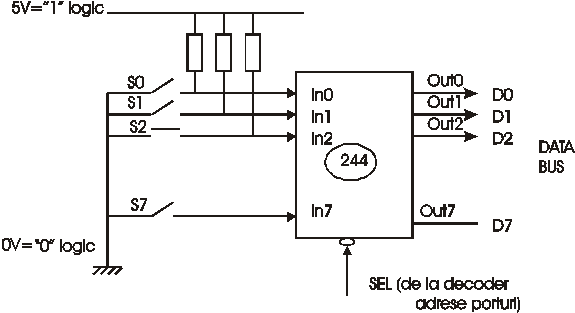 Vom furniza în fig. 7.2. o schema de intrare a unui octet în sistemul de calcul Acest octet va fi furnizat sub forma pozitiei unor microîntrerupatoare (switch - uri) care se pot gasi pe pozitia OFF ("0" logic) (legatura facuta la "0") fie pe pozitia ON (lasata "în aer" = 1 logic). Este o situatie foarte des întâlnita când CPU are de citit configurarea unui echipament periferic acesta furnizându-i octetul prin pozitia unor switch-uri sau "jumpere" aflate pe placa de baza sau placa de extensie (controlerul propriuzis ).