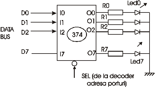 În fig. 7.3. am reprezentat un circuit integrat cu indicativul 374 care are 8 circuite bistabile similar cu circuitul 244 folosit anterior. De data aceasta intrarile acestui circuit sunt cuplate la busul de date a sistemului iar iesirile vor avea cuplate diode luminoase (LED) care vor furniza prin indicatie luminoasa octetul furnizat de sistem. Similar ca în exemplul anterior la selectia adresei portului de iesire dorit, semnalul SEL va face ca starea liniilor de pe busul de date sa fie memorata în cei 8 bistabili ai circuitului. Totodata starea acestora se va regasi la iesirile Q0, ., Q7 ce va face ca unele LED-uri sa se aprinda sau nu dupa cum în bistabili este memorat "0" sau "1" si deci octetul va putea fi "vizualizat" prin starea aprinsa sau stinsa a LED-urilor.
