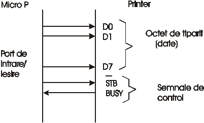 ocupat înca cu tiparirea caracterului. μP poate determina daca printerul este în stare sa primeasca un nou caracter sau nu prin testarea liniei BUSY. Atât timp cât acesta este "1" P nu va transmite un nou caracter. Imediat ce semnalul de pe linia BUSY devine egal cu "0" P poate încarca liniile D0,., D7 cu un nou caracter pentru tiparit stiind ca cel anterior a fost tiparit. Acest proces de interogare poarta denumirea de "handshaking" si este o tehnica curent folosita în transmiterea de date între echipamente cu viteze si caracteristici diferite si care trebuie sa comunice.