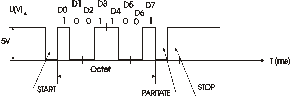 Spre deosebire de transmisiile paralele când existau linii separate de transmisie pentru fiecare rang al octetului transmisia seriala cere existenta numai a doua linii. În acest caz cei 8 biti care formeaza un octet sunt transmisii secvential în 8 intervale de timp diferite. Diagrama din fig. 7.6. reprezinta forma unui semnal serial asa cum ar apare ea daca ar fi vizualizata la un osciloscop.Se observa ca octetul de transmis este încadrat de biti auxiliari necesari pentru sincronizare sau control. Astfel transmiterea unui octet începe cu un bit de start, se continua cu cei 8 biti ai octetului începând cu rangul cel mai mic, urmeaza un bit de control (paritate) si se termina cu un bit de STOP.