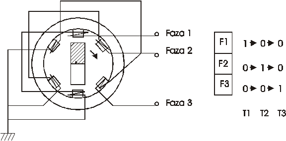 Fig. 7.8 arata modul de comanda a unui astfel de motor, cele 3 faze ale motorului sunt comandate de un registru cu 3 biti.