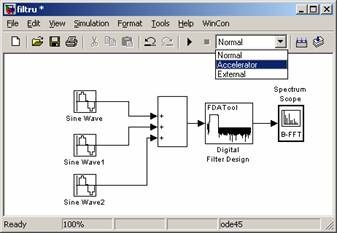 a) Simularea se desfasoara foarte lent si dorim sa acceleram procesul de simulare. Pentru rezolvarea acestui inconvenient Simulink a fost prevazut cu o "tinta" (target) inclusa în mediul respectiv, anume Accelerator