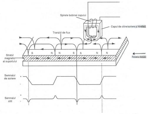 În cursul procesului de scriere, capului i se aplica tensiune electrica si, pe masura ce aceasta tensiune se schimba, polaritatea câmpului magnetic înregistrat se schimba de asemenea. Tranzitiile de flux se scriu exact în punctele în care polaritatea de înregistrare se schimba. Oricât ar parea de ciudat, în timpul procesului de citire, un cap nu genereaza acelasi semnal care a fost scris. În schimb, capul genereaza un impuls, sau vârf de tensiune numai când traverseaza o tranzitie. Când tranzitia trece de la pozitiv la negativ, impulsul detectat de cap este o tensiune negativa. Când tranzitia trece de la negativ la pozitiv, impulsul este un vârf de tensiune pozitiva. În esenta, la citirea de pe suport, capul devine un detector de tranzitii de flux, emitând impulsuri de tensiune de câte ori traverseaza o tranzitie. Zonele fara tranzitii nu genereaza nici un impuls.