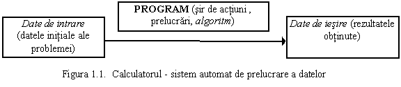 Calculatorul reprezinta un sistem electronic (ansamblu de dispozitive si circuite diverse) complex care prelucreaza datele introduse īntr-o forma prestabilita, efectueaz& 121e48b #259; diverse operatii asupra acestora si furnizeaza rezultatele obtinute (figura 1.1.).