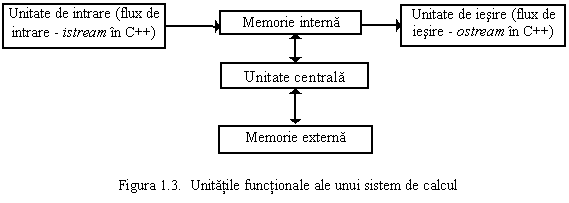 Componentele unui sistem de calcul pot fi grupate īn unitati cu functii complexe, dar bine precizate, numite unitati functionale. Modelul din figura 1.3. face o prezentare simplificata a structurii unui calculator, facilitānd īntelegerea unor notiuni si concepte de baza privind functionarea si utilizarea acestuia. Denumirea fiecarei unitati indica functia ei, iar sagetile - modul de transfer al informatiei.