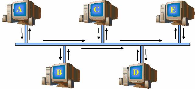 care sunt conectate toate calculatoarele. Cablul de legatura formeaza o linie de legatura de la un capat la altul al retelei. Fiecare calculator este conectat la canalul de comunicatie si transmite mesaje în retea. Fiecare mesaj are un antet care contine adresa calculatorului destinatie.