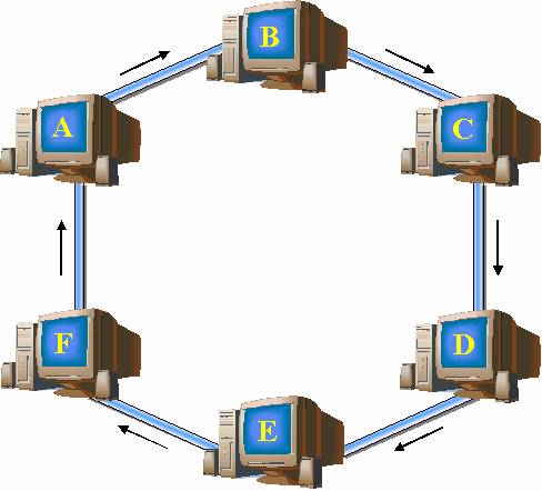 calculator este conectat prin intermediul canalului de comunicatie la alte doua calculatoare, astfel încât mesajele circula de la un calculator la altul, pe un traseu interior, pâna când un calculator recunoaste mesajul transmis. Defectarea unui calculator înseamna întreruperea canalului de comunicatie.