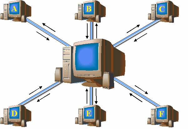 Toate mesajele sunt schimbate prin intermediul calculatorului central, care are