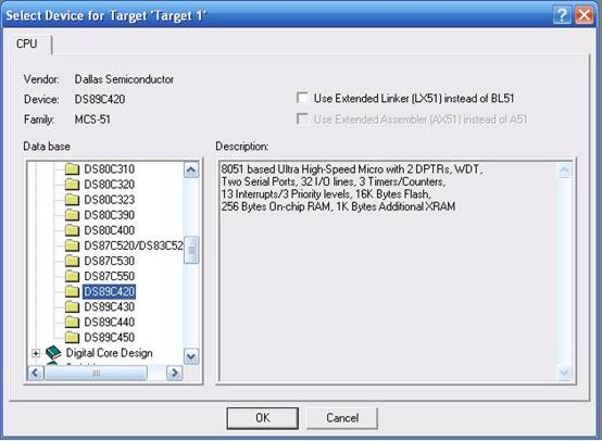 dupa care se introduce numele proiectului. In fereastra care apare se va alege tipul de micocontroler folosit " Dallas Semiconductor DS89C420 '. Aceasta fereastra este ilustrata in figura 4.1.