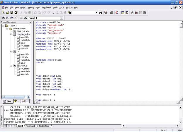 Pentru compilarea programului se foloseste Project > Build Target din bara de meniu. Daca programul este compilat si nu va da nici un mesaj de eroare, atunci compilarea s-a facut cu succes si se va creea fisierul in cod hexa. Compilarea programului este ilustrata in figura 4.3.