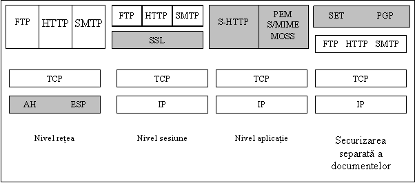 Pentru furnizarea unor servicii care sa asigure cerintele de securitate prezentate au fost propuse mai multe protocoale criptografice. Daca majoritatea acestor protocoale sunt similare īn ceea ce priveste serviciile oferite si algoritmii criptografici folositi, ele difera prin maniera de furnizare a serviciilor si prin situarea lor īn raport cu ierarhia de protocoale TCP/IP. O serie de initiative īncearca implementarea securitatii la nivelul IP; altele peste TCP, la nivel sesiune; altele īncearca extinderea unor protocoale la nivel aplicatie (Ftp, HTTP, Telnet, e-mail) cu facilitati suplimentare de securitate. De asemenea, o serie de initiative propun solutii de securizare a continutului unor documente, independent si mai presus de protocoalele existente la nivel de aplicatie, prin intermediul unor utilitare separate.