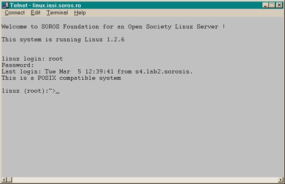 In exemplul anterior am realizat o conectare prin telnet de la calculatorul numit sigma.tuiasi.ro la calculatorul main.sorosis.ro. Odata autentificarea cu nume utilizator si parola realizata apare prompt-ul de pe calculatorul main.sorosis.ro si toate comenzile introduse se executa pe acesta. La introducerea comenzii exit se paraseste sesiunea telnet si se revine pe calculatorul gazda (in cazul nostru sigma.tuiasi.ro).