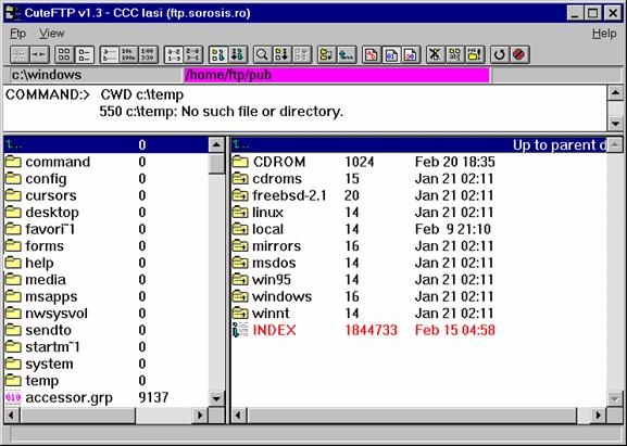 Sa trecem acum la examinarea facilitatilor oferite de programul cute-ftp sub Windows: