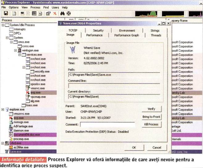 Este cazul să trecem la acțiuni mai în forță, pentru care avem nevoie de niște instrumente mai aparte. Accesați site-ul https://www.microsoft.com/technet/sysinternals/default.mspx , fostul www.sysinternals.com și descărcați de acolo aplicațiile Process Explorer, PsKill, PsList și RootkitRevealer, pe care le veți dezarhiva într-un director pe hard disk. Rulați apoi Process Explorer și validați (Allow) acțiunea în căsuța de dialog pe care motorul de detecție. Kaspersky o să vi-o prezinte. Urmăriți cu atenție lista de procese prezentate. Uitați-vă după nume suspecte de tipul Lsasss.exe sau smess.exe, care seamănă foarte mult cu procesele smss.exe sau lsass.exe din Windows. Puteți folosi funcția de căutare online (clic dreapta pe Process, Search on-line) ca să obțineți mai multe informații despre respectivul proces și să puteți stabili mai ușor legitimitatea lui. Odată detectat un proces suspect, cu clic dreapta pe el și Properties veți obține mai multe informații (calea către executabil este una dintre informațiile de care avem nevoie), încercați să terminați respectivul proces cu ajutorul opțiunilor existente în Process Explorer. Veți observa că serviciul reapare și ori de câte ori l-ați opri, el repornește automat. Notați informațiile pe care le-ați obținut despre el (calea către respectivul executabil și numele procesului). Să luăm ca exemplu adware-ul WhenU, care se găsește în foarte multe kit-uri de instalare, așa-zis gratuite și să vedem cum putem scăpa rapid de el. Pentru orice proces care vi se pare suspect puteți foarte ușor să repetați pașii. Cu ajutorul lui Process Explorer obținem informații interesante: are două procese RelevantKnowIedge și WhenU Save, ale căror executabile sunt rlvknlg. exe și save.exe din Windows\system32\ rlvknlg.exe respectiv Program Files\Save\ Save.exe. înarmați cu aceste informații, vom crea un fișier de tip text de forma eliminare.cmd. în el introducem următoarea secvență pskill -t -u administrator -p parola de administrator save.exe ce va termina procesul. Mai adăugăm liniile attrib -S -H -R -A "c:\Program Files\Save\ Save.exe" (eliminăm toate atributele de protecție ale fișierului) și del /F /Q "c:\ Program Files\SaveVSave.exe". Salvăm fișierul astfel creat în directorul în care se află aplicațiile Sysinternals. Deschidem o fereastră Command Prompt (Start, Run, cmd și navigam către directorul dorit cu secvența cd c:\nume director). Apoi scriem eliminare.cmd și Enter și am scăpat de fișierul buclucaș. Dacă sunt mai multe procese, atunci faceți un singur fișier cu comenzile necesare eliminării lor după structura: închidem procesul cu ajutorul comenzii pskill și ștergem executabilul.