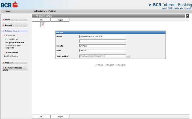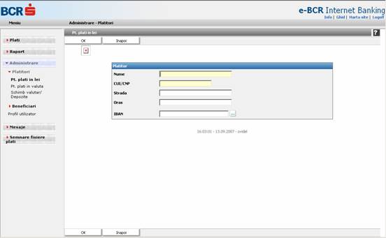Definire Platitori - atit pentru plati in Lei/valuta, cit si pentru produse (Depozite/CDD/Schimburi valutare). Pentru fiecare cont din care se fac plati trebuie sa definiti un platitor. Este obligatoriu sa completati toate cimpurile din fereastra de mai jos: