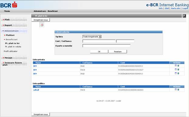 Pentru a introduce un nou Beneficiar apasati 'Inregistrare noua'.