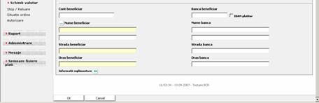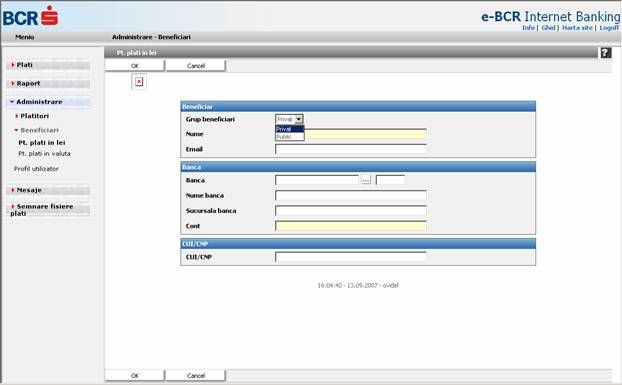 - apasati butonul de selectie din dreptul Banca beneficiar, iar in ecranul de selectia completati: la nume banca: comerciala sau BCR; la Tip: T;