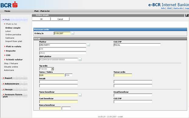 Puteti efectua orice plata din conturile/subconturi curente sau Maxicont (in anumite cazuri) utilizind un Ordin simplu, care se executa o singura data.